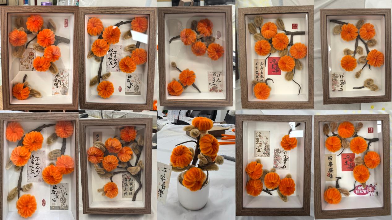 活动伊始,专业指导教师细致讲解扭扭棒的特性与制作技巧,从基础的弯折、缠绕,到如何塑造柿子、枝干、叶子的形态,老师们听得专注,学得认真。在随后的动手环节,大家相互交流、互相帮助,彩色扭扭棒在指尖灵动翻转,逐渐幻化成一个个精巧逼真的柿子,点缀在相框之上,承载着 “柿柿如意” 的美好期许。