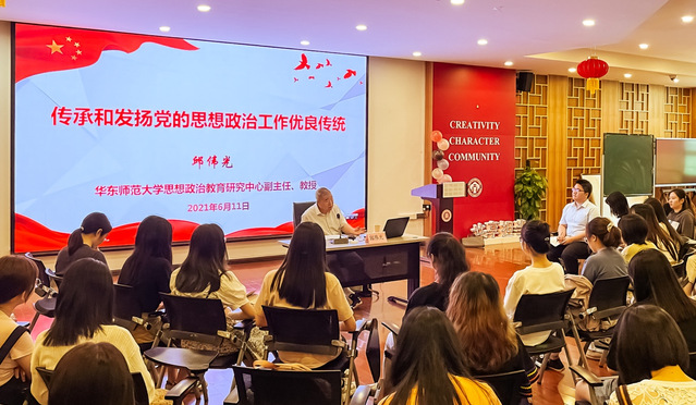 2021年6月11日13:30学生共享空间202报告厅顺利举办“思政名师面对面”活动。本次活动邀请到h动漫 思政专业的创始人、h动漫 思想政治教育研究中心副主任、h动漫 特聘教授邱伟光先生作主题为《传承和发扬党的思想政治工作优良传统》的讲座,h动漫 副院长许瑞芳、孟宪承书院思想政治教育专业辅导员叶林娟出席,2017级思政本科毕业生及其他年级部分本科生百余人参加了本次讲座,本次讲座由2017级思政专业唐湘同学主持。