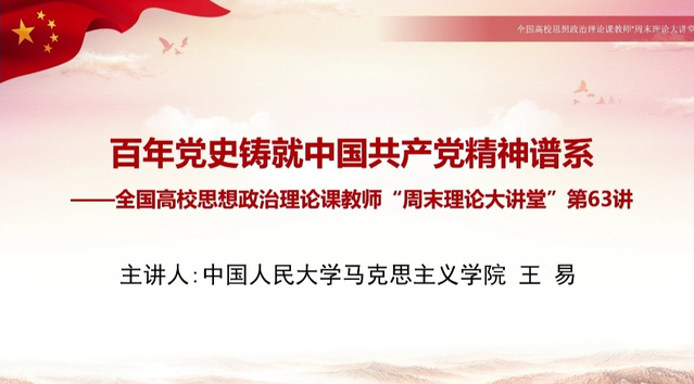 为深入贯彻落实习近平总书记在学校思想政治理论课教师座谈会上的重要讲话精神,引导学生深刻领悟习近平总书记提出的思政课教师“六方面素养”、思政课改革创新“八个统一” 的要求,学院2020级研究生于2021年6月25日14:30自行观看周末理论大讲堂系列讲座第63讲——《百年党史铸就中国共产党精神谱系》。